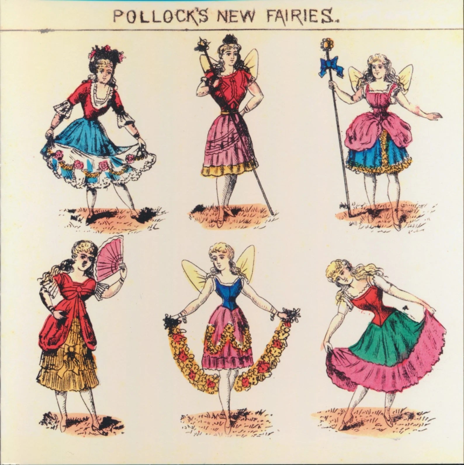 Six Victorian ladies in ornate fairy costumes line up or curtsy, just as if they were appearing on stage in the 1880s. This pretty illustration is reproduced from a hand-coloured original print of toy theatre characters by Benjamin Pollock of Hoxton Street.