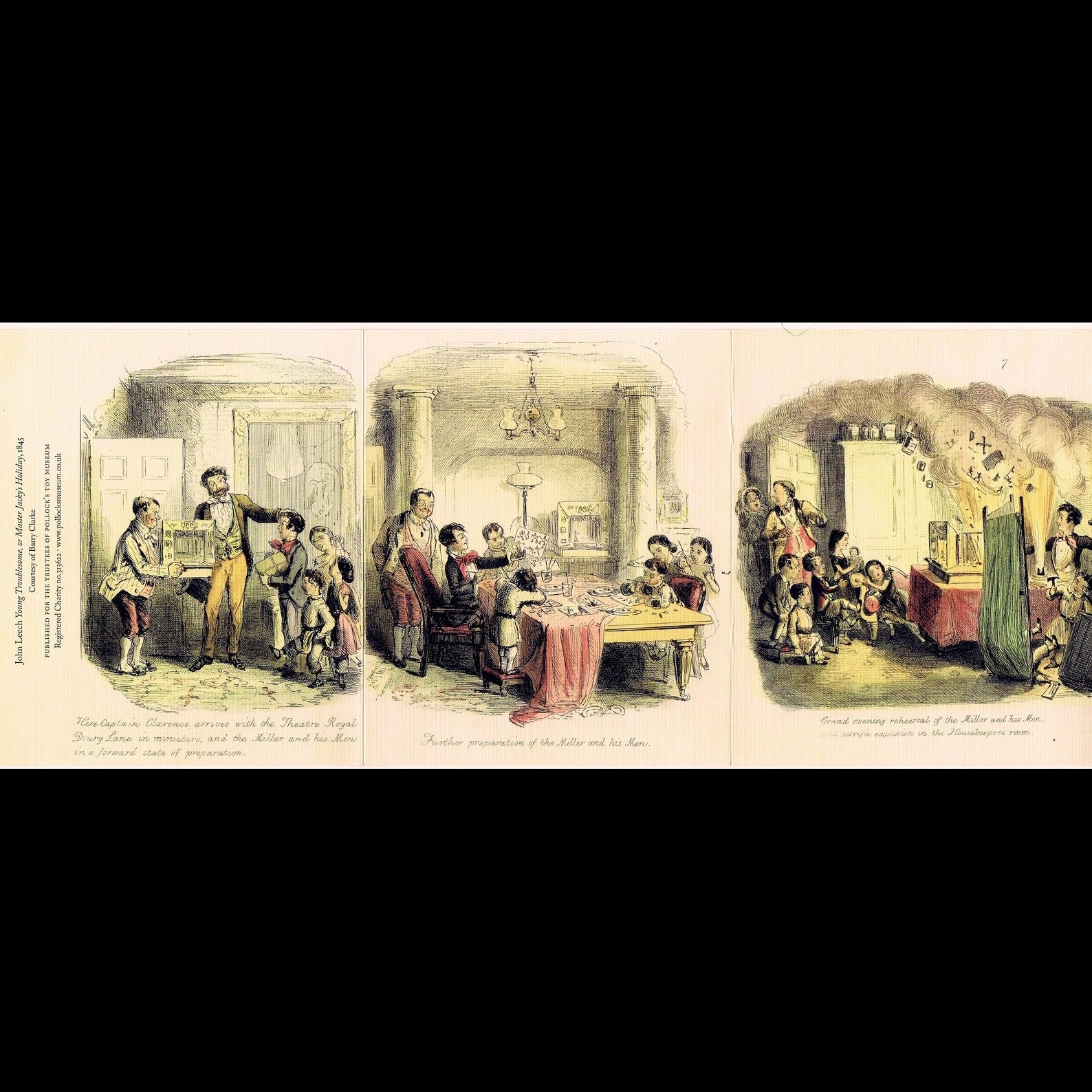 Three scenes showing a disastrous toy theatre performance in a Victorian home, taken from John Leech's 1846 Young Troublesome or Master Jacky's Holiday. Follow the scenes to discover the story, and the hazards of lighting your show with a naked flame!